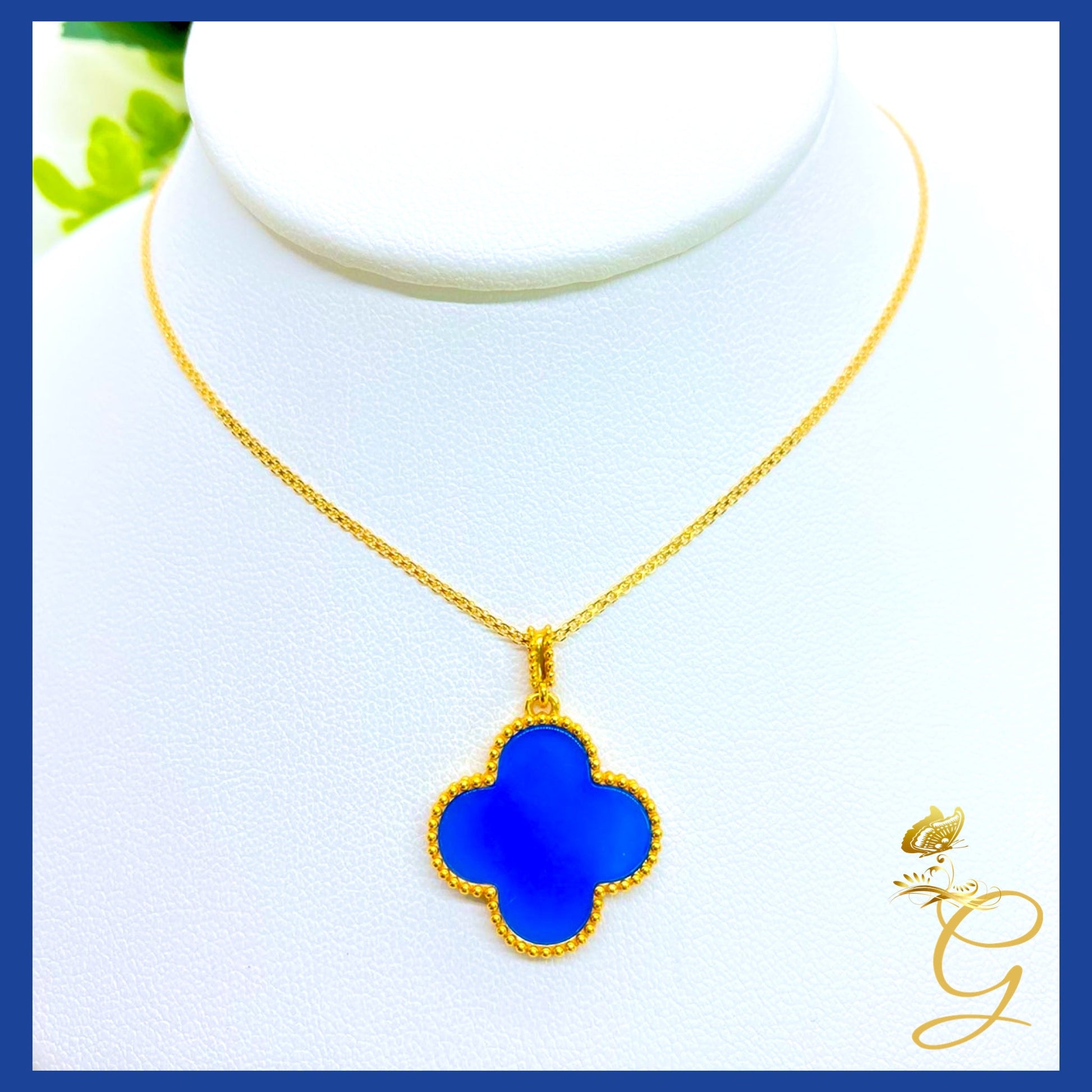 18K Real Gold Blue 20mm Cloverleaf Necklace 18”