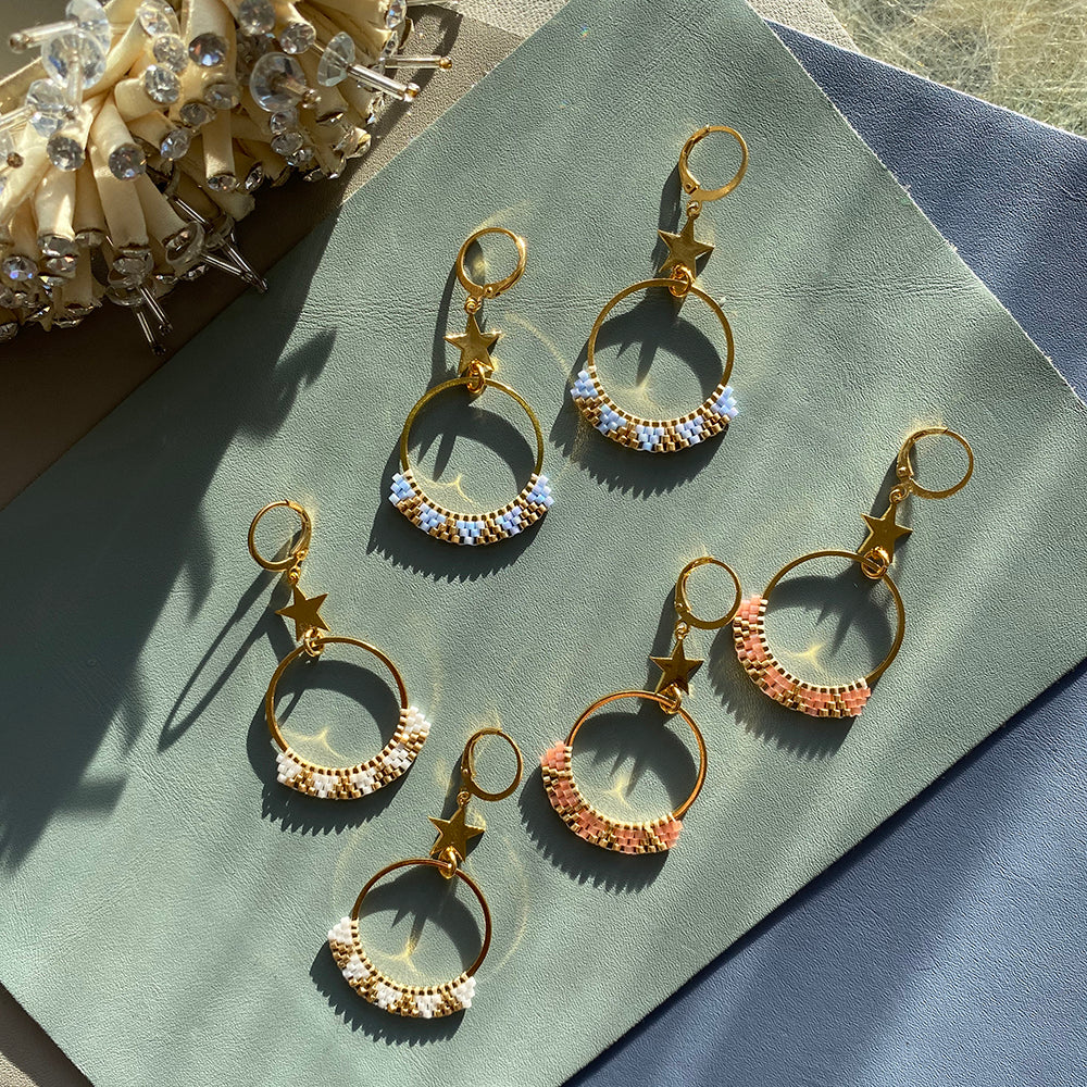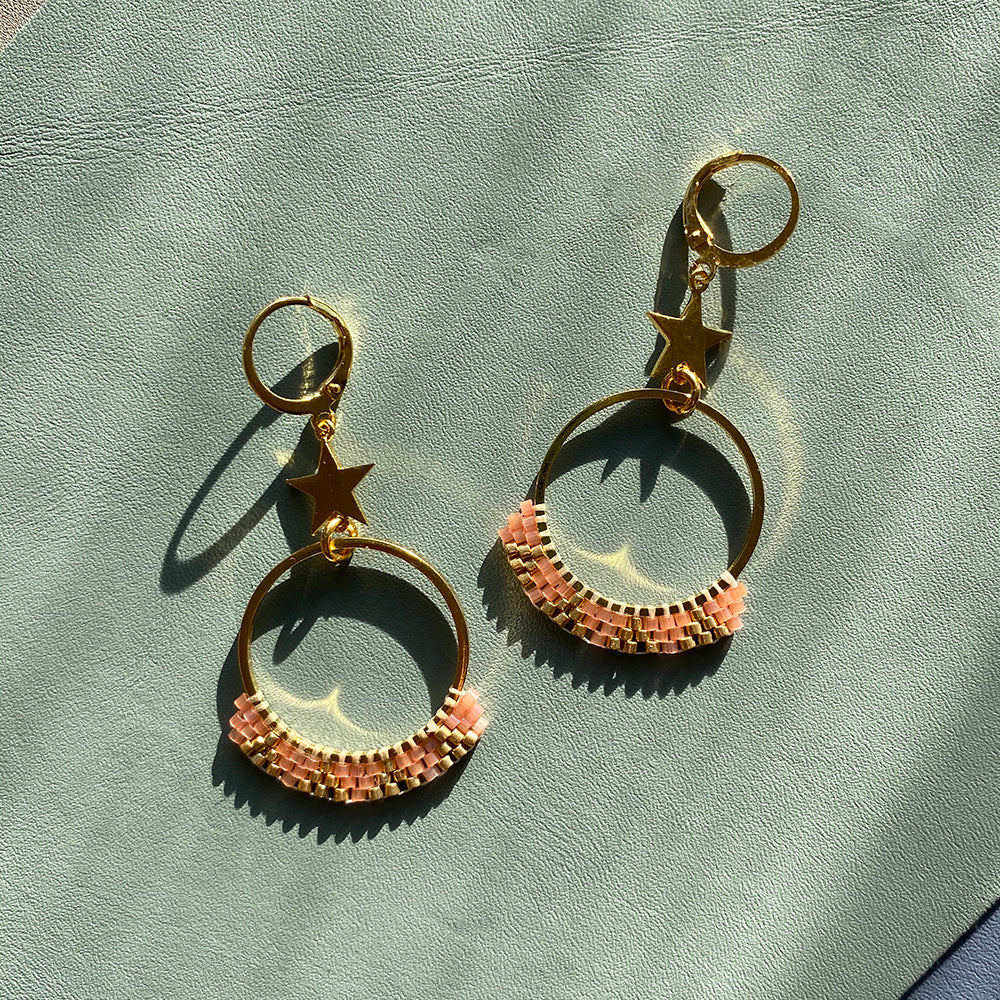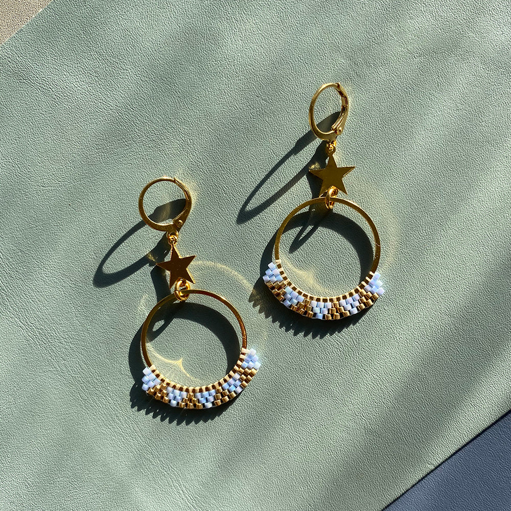 Sadie has chosen a combination of nude-toned peach, pastel blue, 24 carat electro plated gold, and shimmering white glass beads. These earrings are hand beaded by Sadie with tiny glass seed beads, and because the beads are so delicate, these earrings are lightweight, too