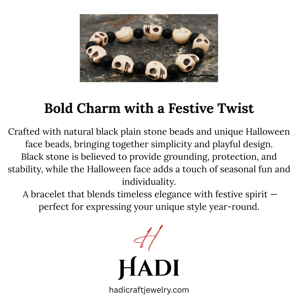 Features carved Howlite skull beads with a matte finish, complemented by sleek **black round spacer beads** for striking contrast.