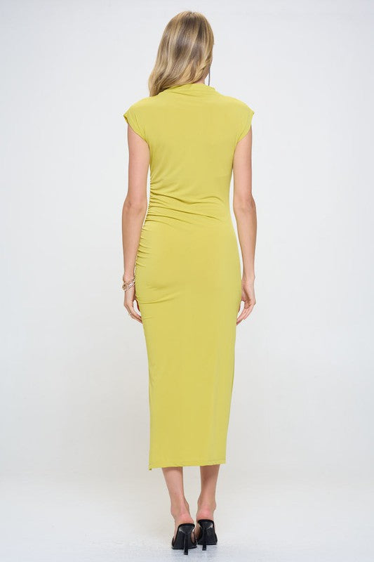 Made in USA Sleeveless Ruched Dress with Slit. Available in other Colors. Fabric content: 95% Polyester, 5% Spandex.