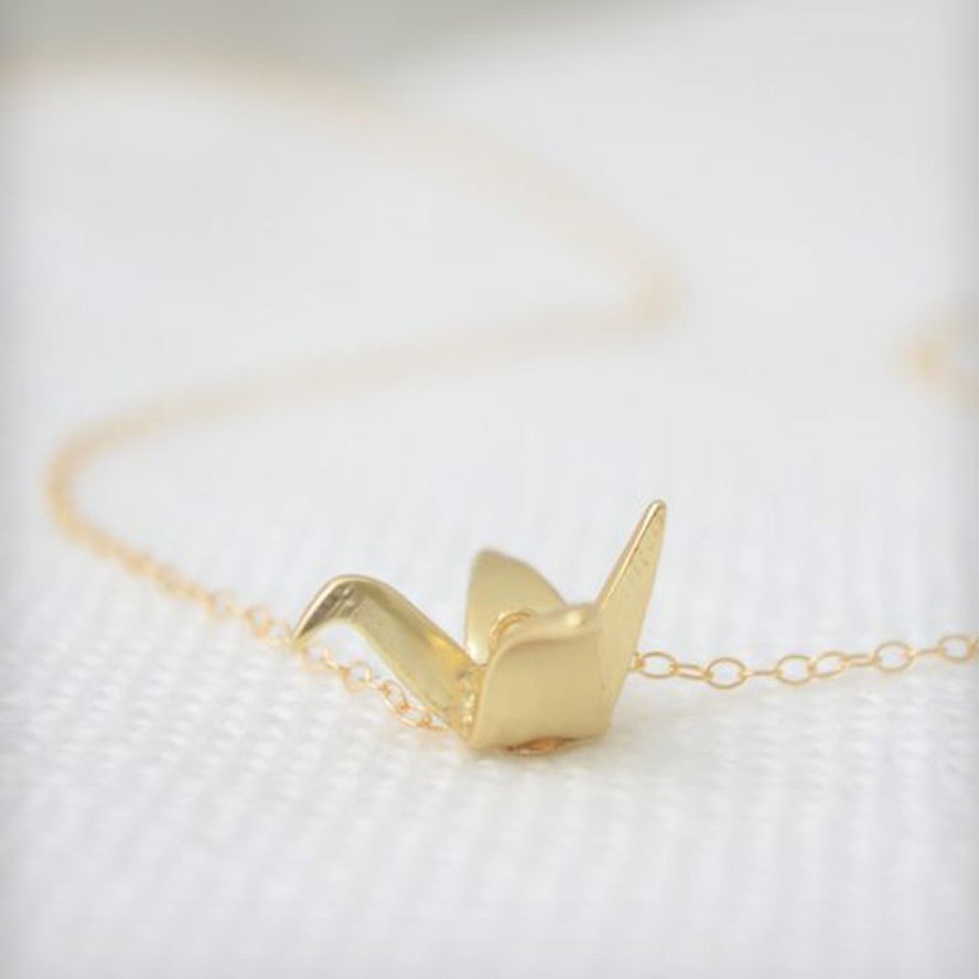 - Simple, elegant gold origami crane hangs from a shiny, petite gold necklace.