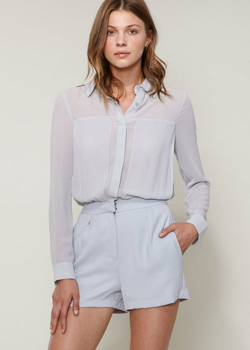 This romper has lightweight semi-sheer fabric on the top. The top of the romper has button up closure with a sharp collar.