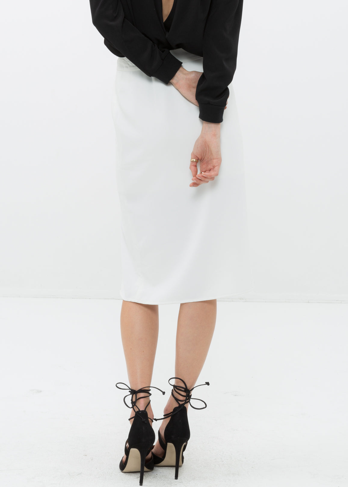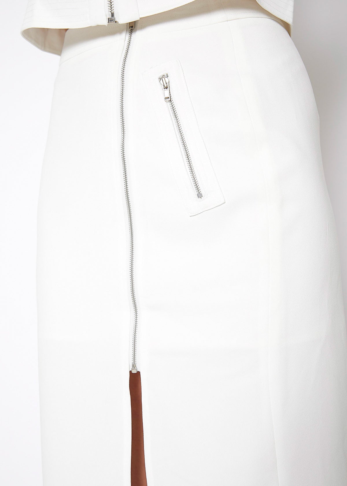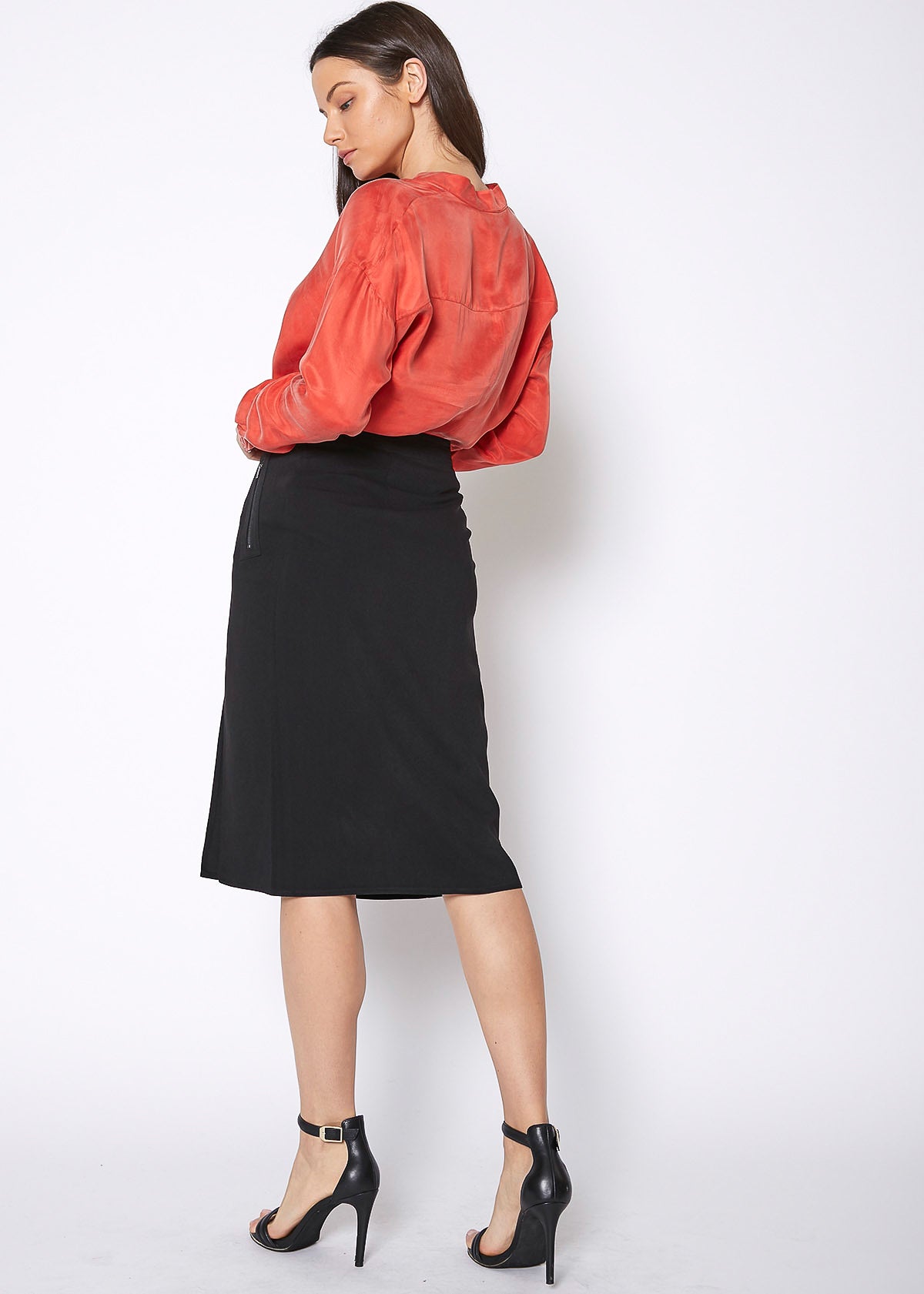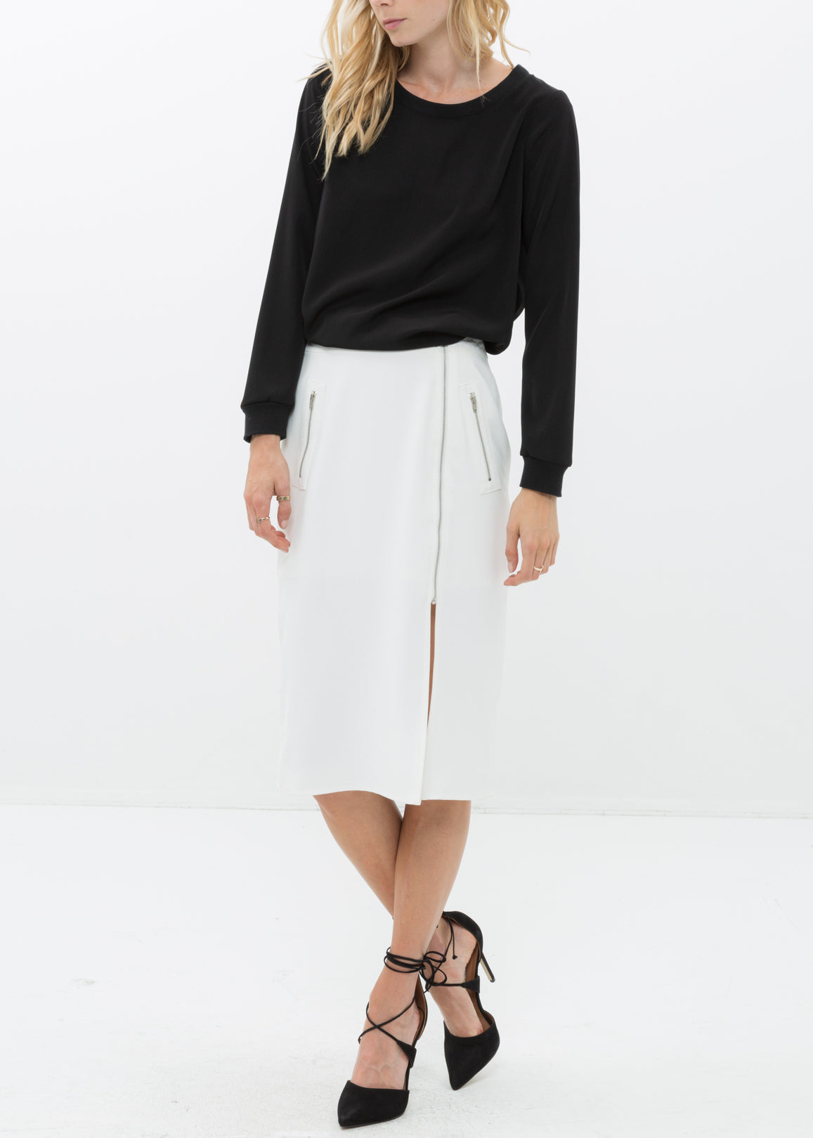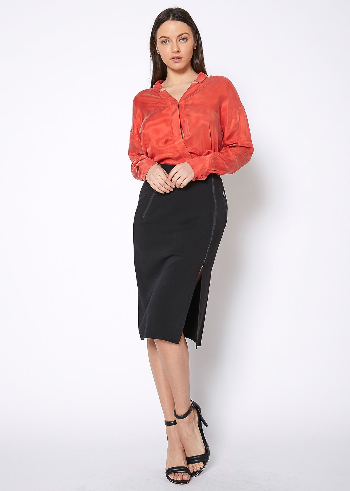 Women's midi skirt with slit hem, zip up closure.