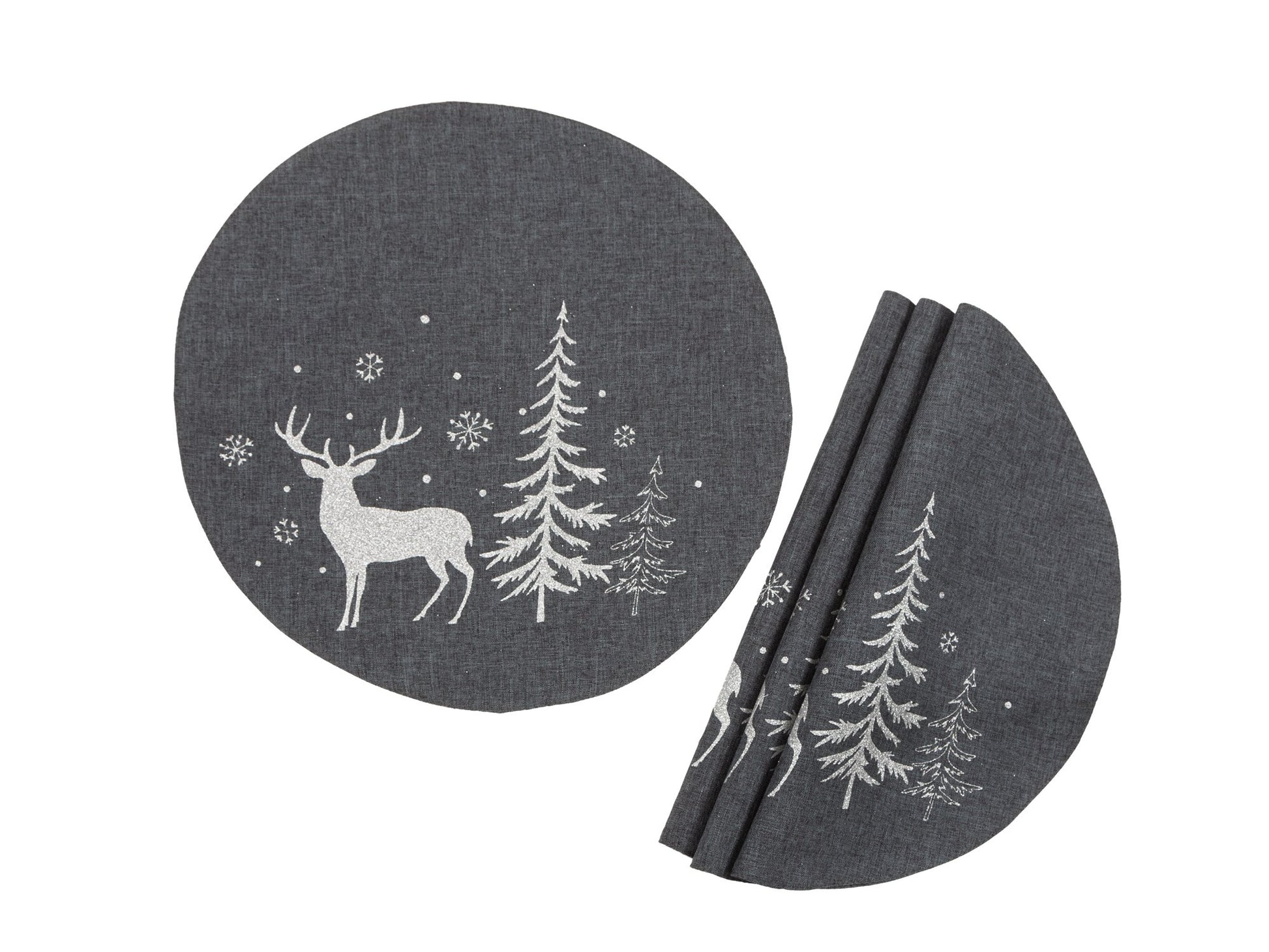 Shimmering deer in forest in winter printed on christmas red or gray fabric. Christmas dinner will be perfectly accented with these warm and inviting holiday linens!